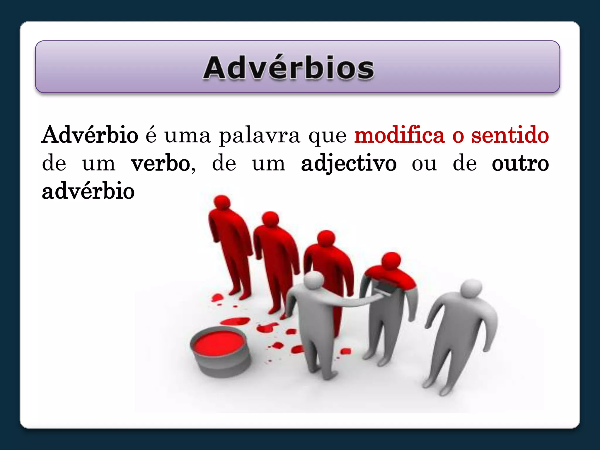 O documento descreve os diferentes tipos de advérbios e suas funções. Apresenta exemplos de advérbios de modo, tempo, lugar, afirmação, negação e intensidade. Também menciona locuções adverbiais, que são expressões equivalentes a advérbios e geralmente começam com preposições ou contrações.