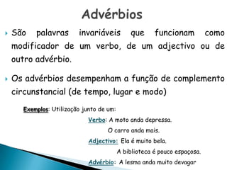 Advérbios modificam verbos, adjetivos ou outros advérbios para indicar tempo, lugar, modo ou intensidade. Eles podem ser formados acrescentando o sufixo "-mente" aos adjetivos ou ser locuções de palavras. Exemplos incluem "depressa", "mais", "muito" e "pouco espaçosa".
