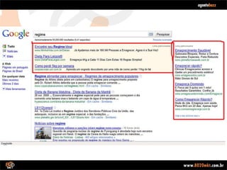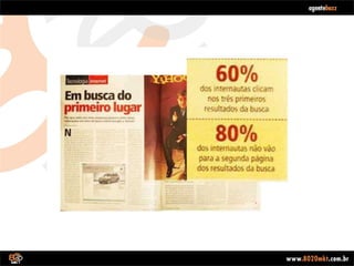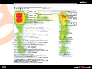 Somos avessos apublicidade Orgulho: Se buscamos, queremos nós mesmos encontrar 10% dos clicks são em links patrocinados Clicks predominam entre novos internautas e quem já possui a cultura do click Clicks filtrados por interesse específico ( ótimo )