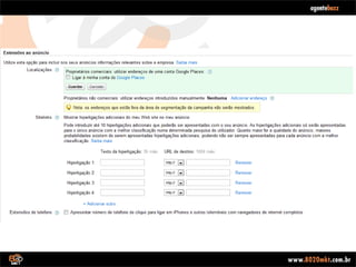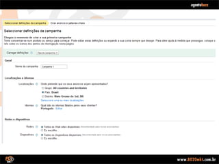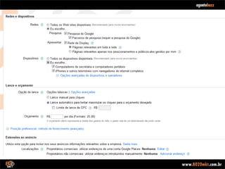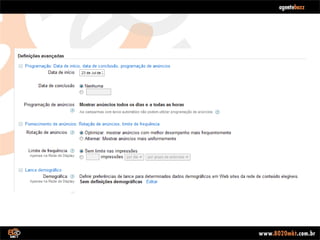 Não jogue napágina principal, tente realmente solucionar o problema do internauta, leve para um produto, cadastro, promoção ou artigo interessante. Algo grátis ou exclusivo. Iniciar com R$0,24 a R$0,50 por palavra, observar o lance mínimo Primeiras semanas acesse diariamente, depois uma vez por semana ou como desejar Banners flash, menos de 50kb e 30 seg.