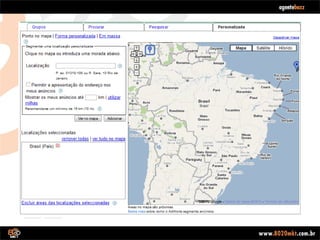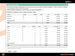 Você pode segmentarcampanhas por região, faixa etária, sexo, redes de conteúdo, etc. Redes de Conteúdo englobam Sites, Blogs, Portais, Orkut, Youtube, etc, e anunciantes AdSense Taxa de Conversão (CTR) e Índice de Qualidade Taxa de Conversão: Quantidade de visualizações X Clicks e Índice de Qualidade envolve: qualidade das Palavras-Chaves, do link de destino, da estrutura do anúncio, etc.