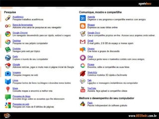 Fundado por LarryPage e Sergey Brin em 1996 Corresponde a 95% das buscas no Brasil Oferece diversos serviços , dentre eles Orkut, Adwords, Blogger, Youtube, Picasa, etc.