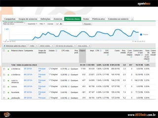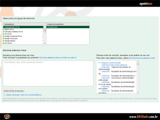 Objetivo: Tráfego, inscrições,vendas, Marca (visualização) Defina verba, diária e mensal - Quanto quer ou o que quer ganhar? Defina a conversão (inscrição, compra, envio) Tente definir uma promoção ou lançamento, palavras focadas a ação, não abra tanto para institucional Roda Mágica (busca no google) e Google Insights Bom utilizar até 200 palavras-chaves Pesquise várias vezes por palavras-chaves, experimente, ferramenta associação Palavras erradas Palavras soltas, compostas, variações sem acentuação Evite nome da sua empresa, produto, com isso melhor pegar nome do concorrente