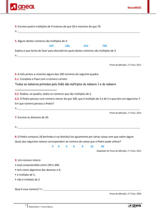 O documento apresenta nove exercícios sobre múltiplos e divisores de números naturais. Os exercícios pedem para identificar e calcular múltiplos de 2, 5, 3 e 9, determinar restos de divisões, escrever o maior número possível com algarismos dados e dividir berlindes igualmente por caixas.