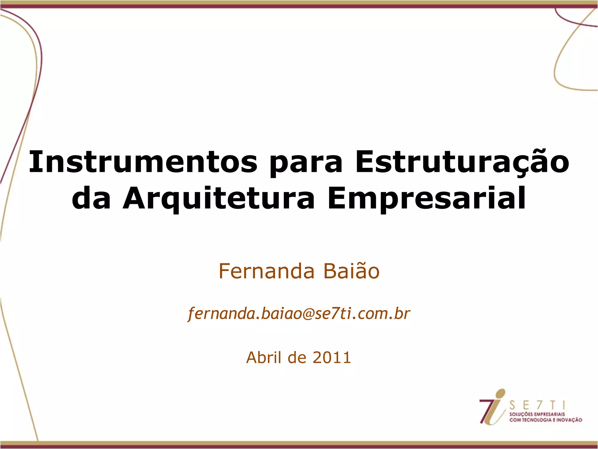 O documento discute como a arquitetura empresarial pode resolver problemas comuns das organizações relacionados à tecnologia da informação, como falta de flexibilidade e alto custo de adaptação dos sistemas. Apresenta os principais elementos da arquitetura empresarial, como arquitetura corporativa, de negócios, da informação e de sistemas. Defende que modelando a organização e estabelecendo um canal de comunicação é possível ter um conhecimento compartilhado e linguagem comum.