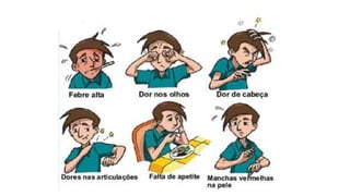 O documento descreve três doenças virais transmitidas pelo mosquito Aedes aegypti: dengue, chikungunya e zika. A dengue causa febre alta e dores musculares e nas articulações. A chikungunya também causa esses sintomas e dores intensas nas articulações. A zika raramente causa sintomas e está associada à microcefalia em bebês e à Síndrome de Guillain-Barré.