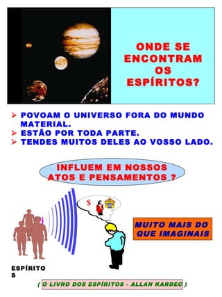 Os espíritos habitam o universo e influenciam nossos pensamentos e ações, ligados à lei da afinidade. A obsessão espiritual é resultado de imperfeições morais, e a reforma íntima, através de preces e práticas do bem, pode afastar essas influências negativas. O perdão e a compreensão são essenciais para a libertação do estado de obsessão, transformando o processo educativo em uma superação moral.