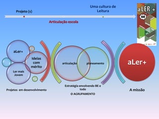 Este documento descreve vários projetos e atividades realizados por bibliotecas escolares de um agrupamento para promover a leitura e literacia. Inclui projetos como "Várias leituras, mais saberes!" para preparar alunos para a leitura e pesquisa, "Apoio ao saber" para desenvolver competências digitais, e "A vida também se lê" para angariar mais leitores entre alunos e a comunidade.
