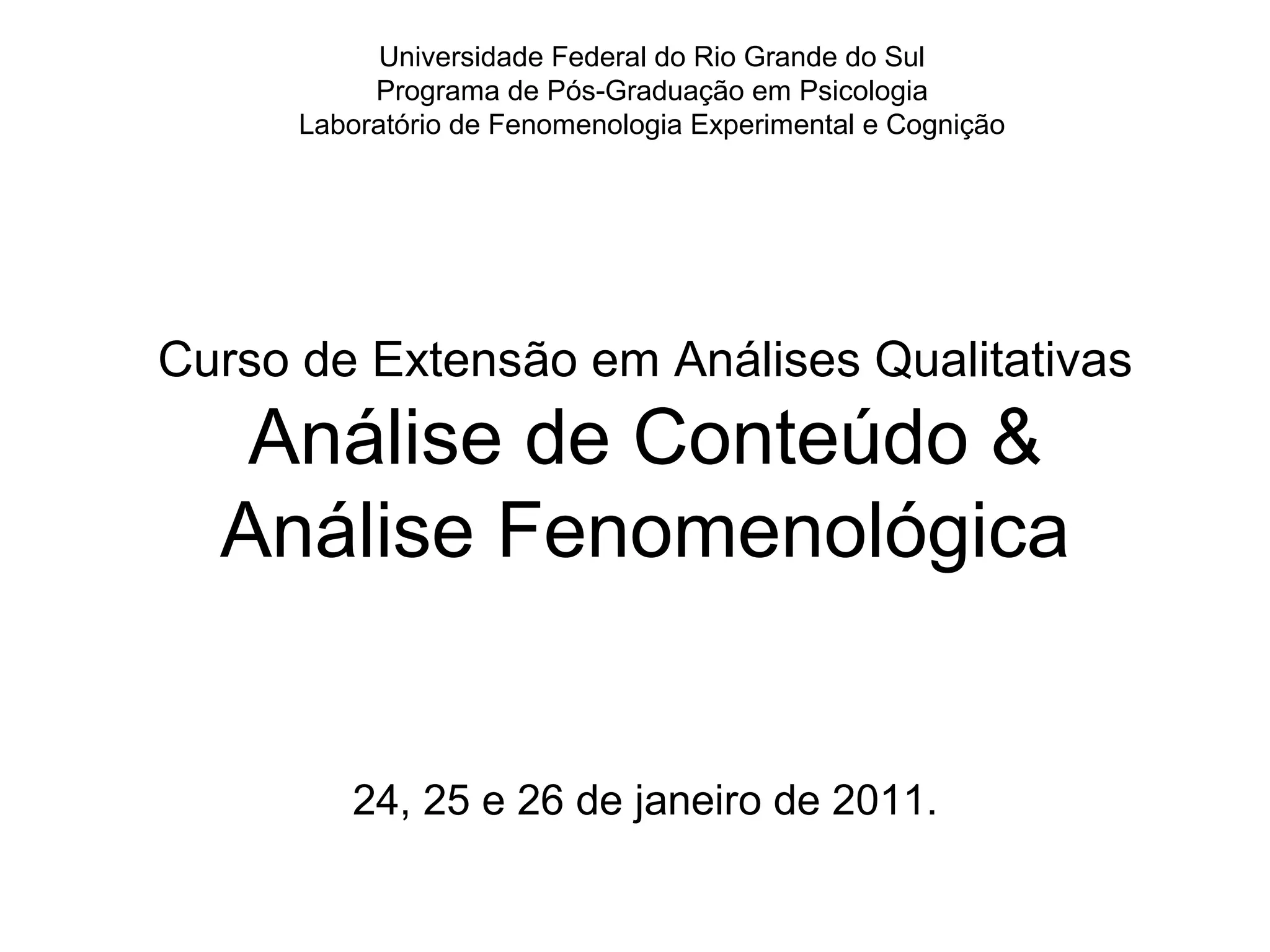 O documento aborda um curso de extensão sobre análises qualitativas, focando na abordagem fenomenológica e análise de conteúdo, explorando conceitos fundamentais como a intencionalidade da consciência e a importância da perspectiva de primeira pessoa. Discute a aplicação da pesquisa fenomenológica em diversas ciências sociais, buscando entender as experiências individuais e suas essências. Além disso, destaca a complexidade da análise de dados e os desafios enfrentados pelos pesquisadores ao empregar essa metodologia.