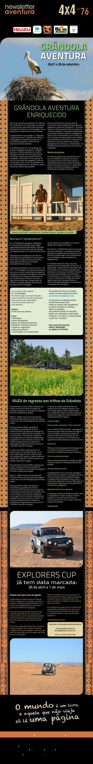 O documento descreve o evento "Grândola Aventura", um desafio de navegação e fotografia em veículos 4x4 que ocorre na cidade de Grândola, Portugal. O evento inclui a descoberta de locais marcados com GPS para fotografar e desafios adicionais de navegação. A Isuzu D-Max é o veículo oficial do evento e será usado para marcar os locais deste ano.