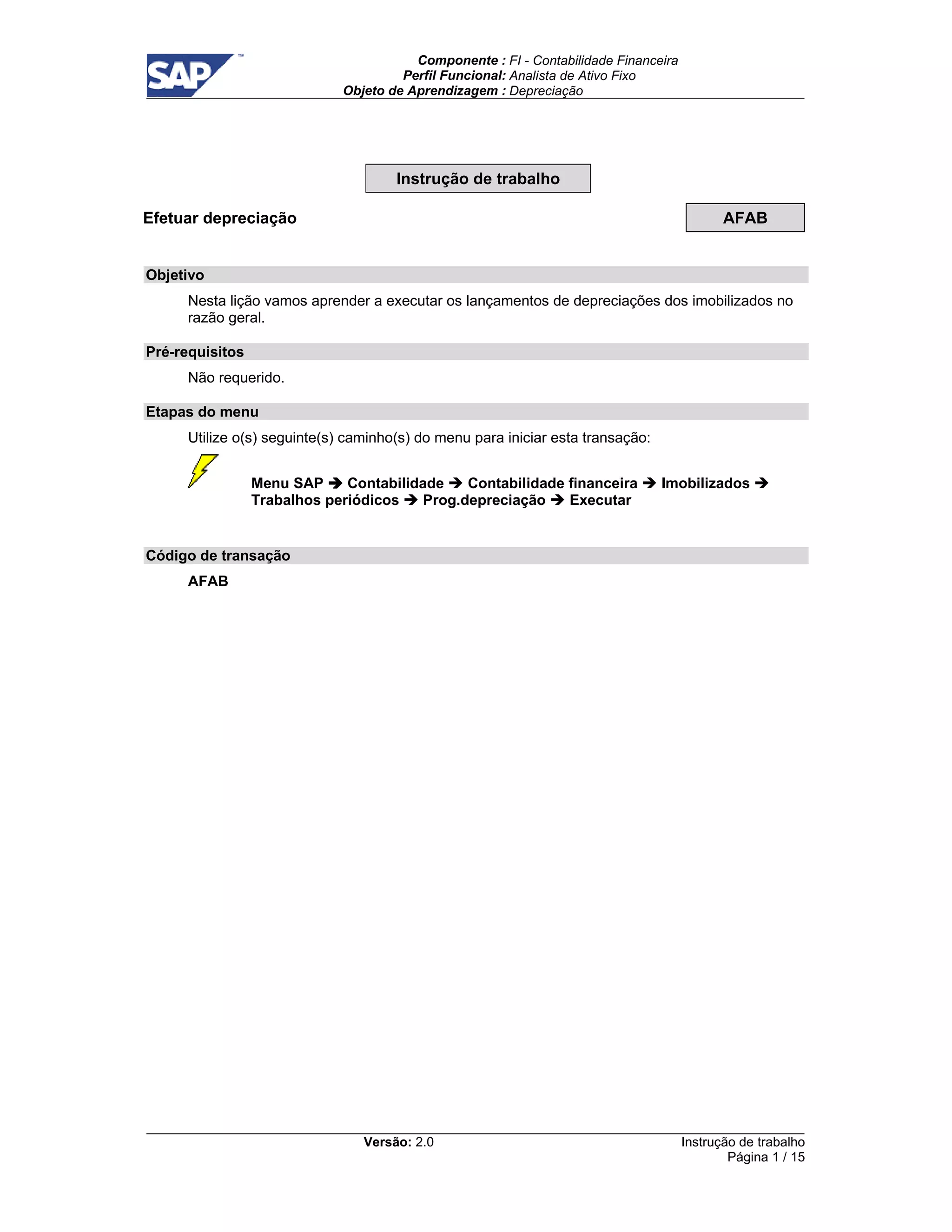 Este documento fornece instruções passo-a-passo para registrar depreciações de ativos fixos no SAP, incluindo selecionar a empresa e período, iniciar o programa de depreciação, verificar o log e lista de saída, e confirmar a conclusão do processo.