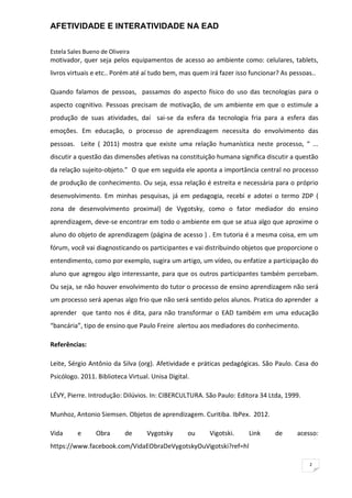 O documento discute a importância da afetividade e interatividade no ensino a distância (EAD). Argumenta-se que as tecnologias de informação e comunicação (TICs) são ferramentas importantes, mas que o envolvimento humano e as relações afetivas entre os envolvidos no processo de ensino-aprendizagem são cruciais para um aprendizado significativo. Também se destaca a necessidade de usar as TICs de forma natural e não excessiva para não comprometer o aprendizado.