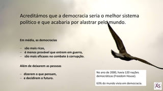 1. Existem dúvidas crescentes sobre se a democracia é realmente o melhor sistema político devido ao sucesso econômico da China e problemas em democracias emergentes e estabelecidas.