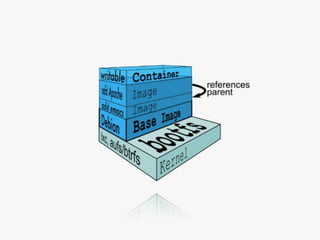O documento discute o que é Docker, incluindo: (1) Docker é uma ferramenta de virtualização ao nível do sistema operacional usando contêineres leves; (2) Contêineres são mais leves do que máquinas virtuais e compartilham o kernel do sistema operacional anfitrião; (3) Docker usa namespaces e cgroups do kernel Linux para isolar recursos e fornecer multi-tenancy.