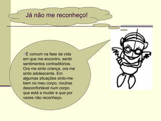 O documento discute as mudanças físicas e emocionais que ocorrem durante a puberdade. A puberdade começa entre 8-12 anos e é iniciada quando a hipófise libera hormônios que causam o desenvolvimento de caracteres sexuais secundários e a capacidade reprodutiva entre 18-19 anos. As mudanças incluem crescimento, mudanças na voz, pelos e sudorese nos rapazes e menstruação, desenvolvimento dos seios e pelos nas raparigas.