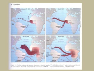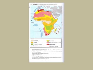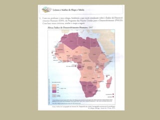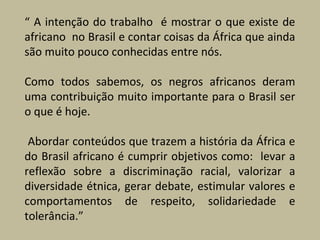 O documento discute a contribuição africana para o Brasil, objetivos de abordar a história da África e do Brasil africano como promover a reflexão sobre a discriminação racial e valorizar a diversidade. Ele também menciona a eleição de Nelson Mandela na África do Sul e inclui mapas da África.