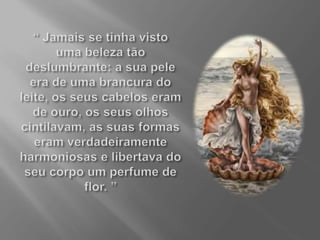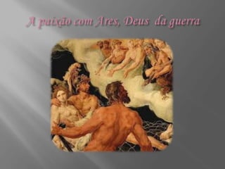 Afrodite nasceu da espuma do mar após os órgãos genitais de Urano caírem nele. Ela foi levada ao Olimpo e se apaixonou por Ares, o deus da guerra. Afrodite representava a beleza e o amor e era frequentemente retratada com rosas, murtas e pombas.