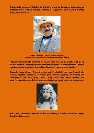 Agatha Christie foi uma escritora britânica conhecida como a "Rainha do Crime". Criou personagens famosos como Hercule Poirot e Miss Marple e vendeu mais livros do que qualquer outro autor. Um de seus livros mais famosos foi "Um Crime no Expresso do Oriente", onde Poirot investiga um assassinato a bordo de um trem e descobre conexões inesperadas entre os passageiros.