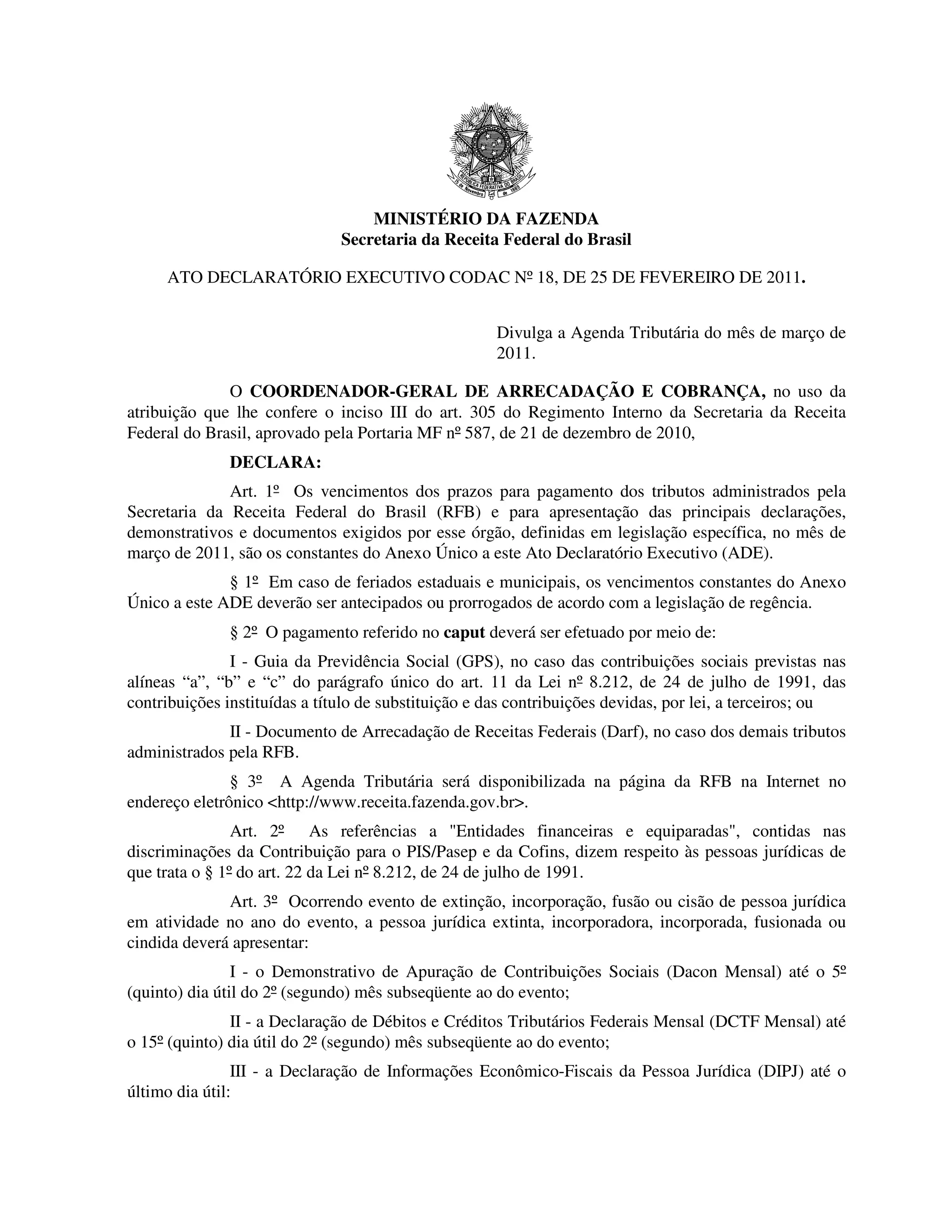 O documento divulga a agenda tributária do mês de março de 2011 no Brasil, definindo as datas de vencimento para pagamentos de tributos e apresentação de declarações fiscais. Além disso, fornece instruções sobre situações especiais como extinção e fusão de empresas e saída definitiva do país.