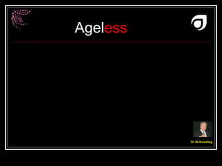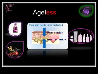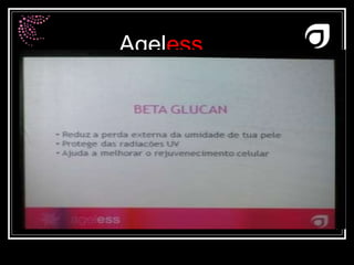 O documento descreve os produtos da linha Ageless, que utiliza a ciência da cosmiatria para tratar a pele de forma intensiva e efetiva. A linha contém sete geléias (limpeza, esfoliante, tônico antioxidante, hidratantes diurno e noturno, sérum anti-idade e para a área dos olhos), que regeneram a pele e melhoram sua aparência sem o uso de produtos químicos. A Ageless é pioneira nessa abordagem nutritiva por dentro e radiante por fora.