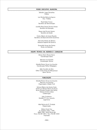 Este documento apresenta a Agenda 21 do município de Curaçá, Bahia. Contém informações sobre a história do município, a metodologia utilizada para construir a Agenda 21 de forma participativa em cada localidade, e as propostas resultantes dos trabalhos realizados em seis áreas do município, cobrindo temas como recursos naturais, agricultura sustentável, infraestrutura e desigualdades sociais. A Agenda 21 de Curaçá foi construída com a participação de mais de 1000 pessoas e tem o objetivo de