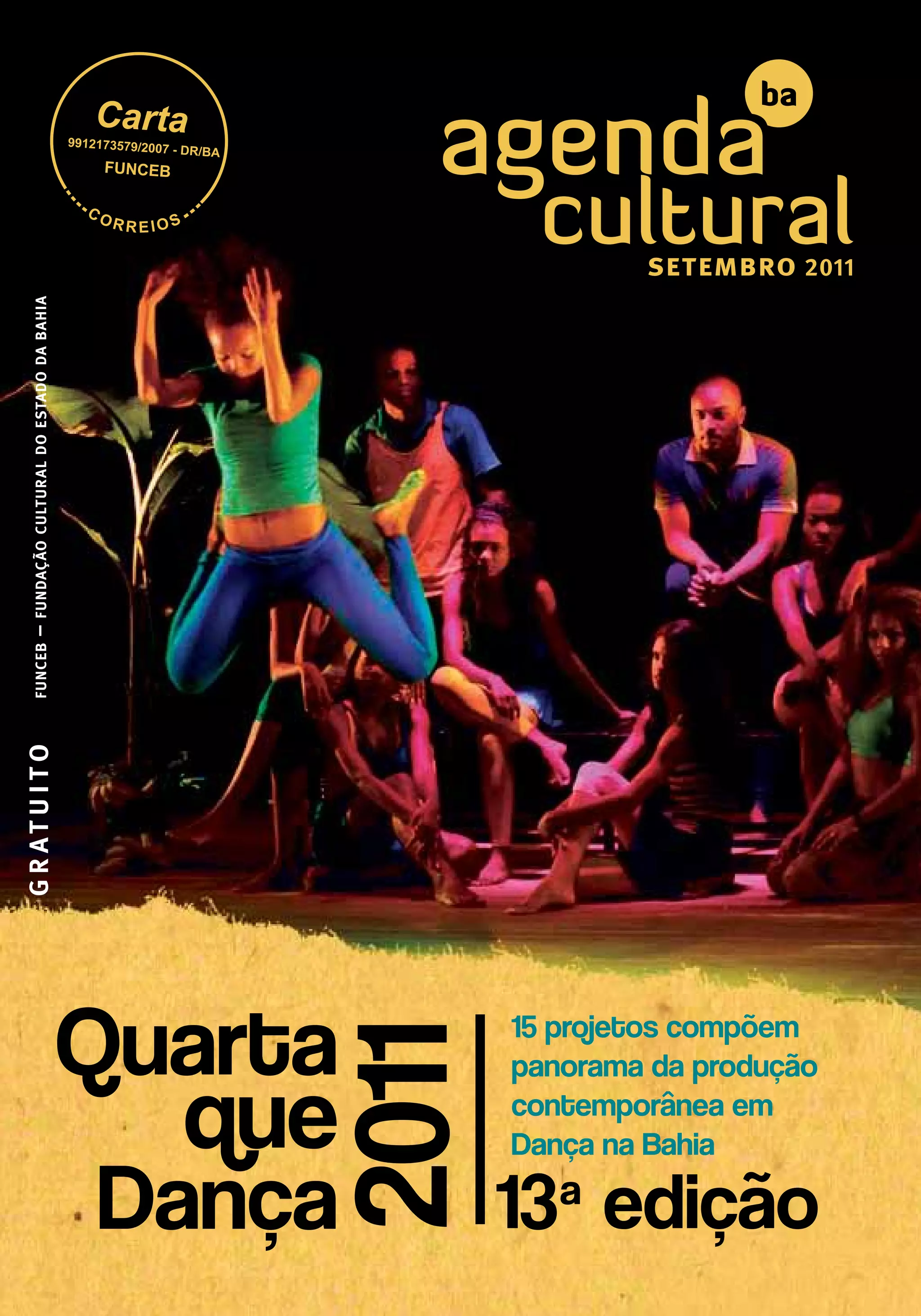 Este documento apresenta a programação cultural do mês de setembro de 2011 no estado da Bahia, destacando exposições de artes visuais, mostras de cinema, espetáculos de dança, teatro e música.