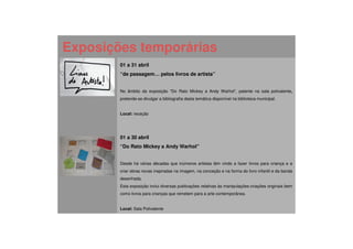 Este documento apresenta a agenda cultural e educativa da Biblioteca Municipal de São João da Madeira para o mês de abril de 2012, incluindo exposições, workshops, entrega de prémios, atividades para famílias e programas para seniores.