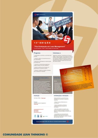 O documento descreve os desafios econômicos de 2013 e as opções para enfrentá-los. A COMUNIDADE LEAN THINKING oferece ferramentas para criar novas competências e se preparar para a crise ou identificar oportunidades. Sua agenda formativa de 2013 inclui workshops, um MBA online e o projeto "O DESAFIO LEAN TOTAL".