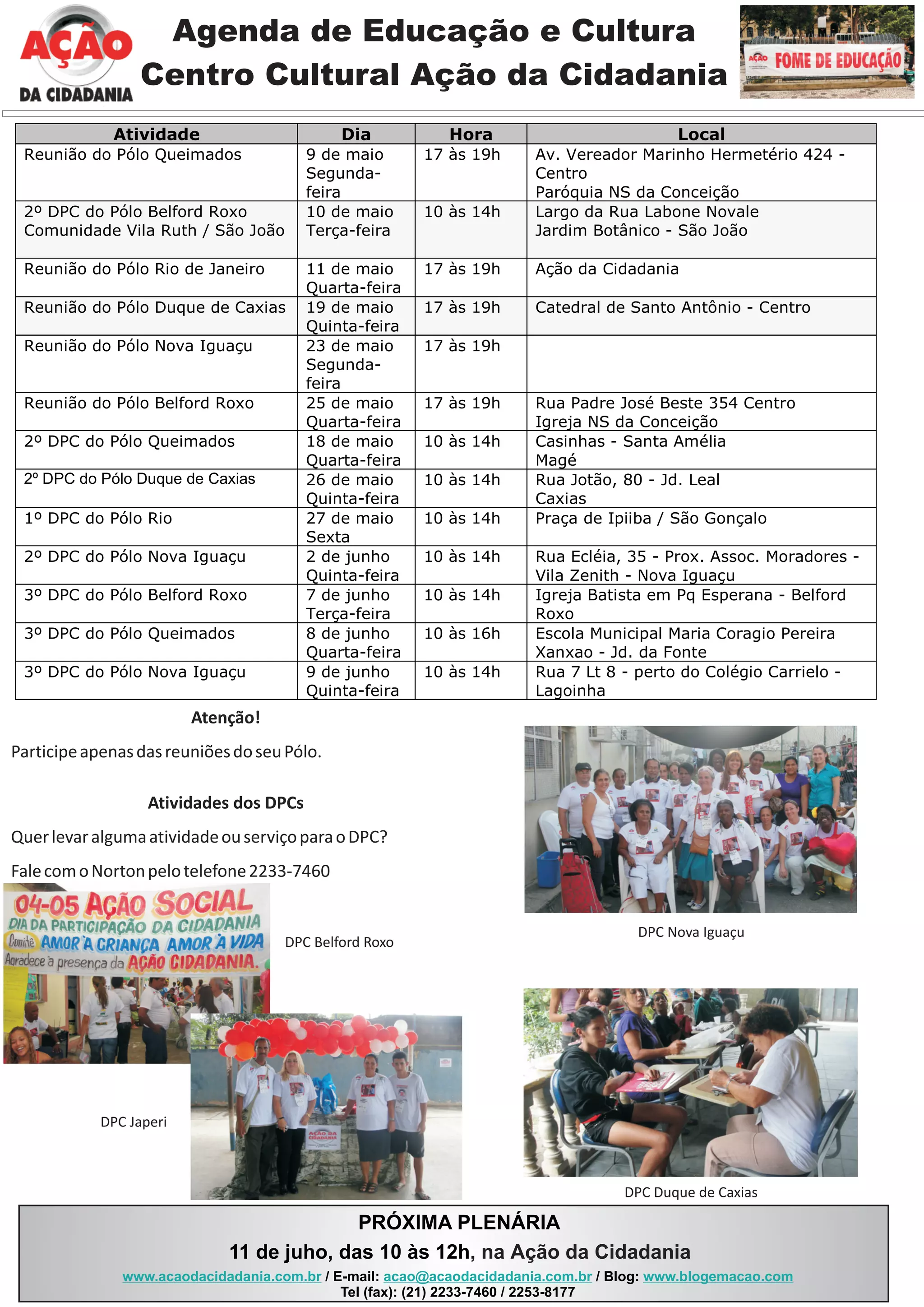 Reuniões e encontros de diversos pólos educacionais serão realizados entre os dias 9 a 27 de maio em locais como a Ação da Cidadania, Igrejas e escolas. Dois encontros do Conselho do Pólo de Belford Roxo acontecerão nos dias 10 e 25, enquanto reuniões em Queimados, Rio de Janeiro, Duque de Caxias e Nova Iguaçu ocorrerão entre os dias mencionados. Atividades adicionais poderão ser levadas aos Conselhos pelo contato Norton.