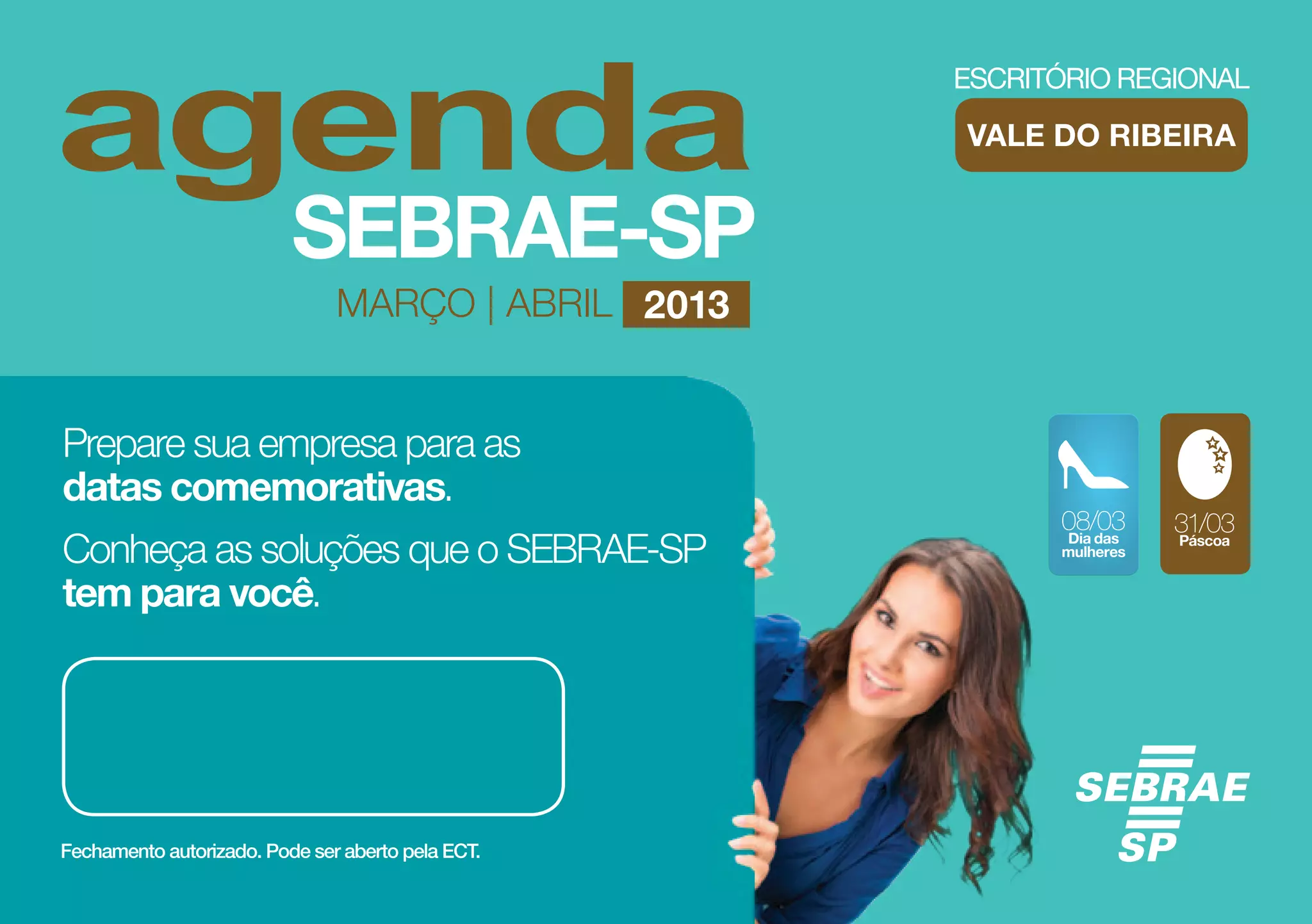Este documento fornece informações sobre eventos, consultorias e palestras oferecidas pelo SEBRAE-SP Vale do Ribeira em março e abril de 2013, incluindo datas comemorativas, temas como administração, marketing e legislação.