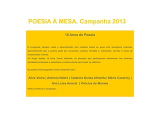 Este documento apresenta o programa da campanha "Poesia à Mesa 2013" em São João da Madeira, que ocorre entre 16 e 23 de março. O programa inclui lançamentos de livros, oficinas, tertúlias poéticas, espetáculos e outras atividades para celebrar a poesia. Os poetas homenageados neste ano são Alice Vieira, António Nobre, Catarina Nunes Almeida, Mário Cesariny, Ana Luísa Amaral e Vinicius de Moraes.