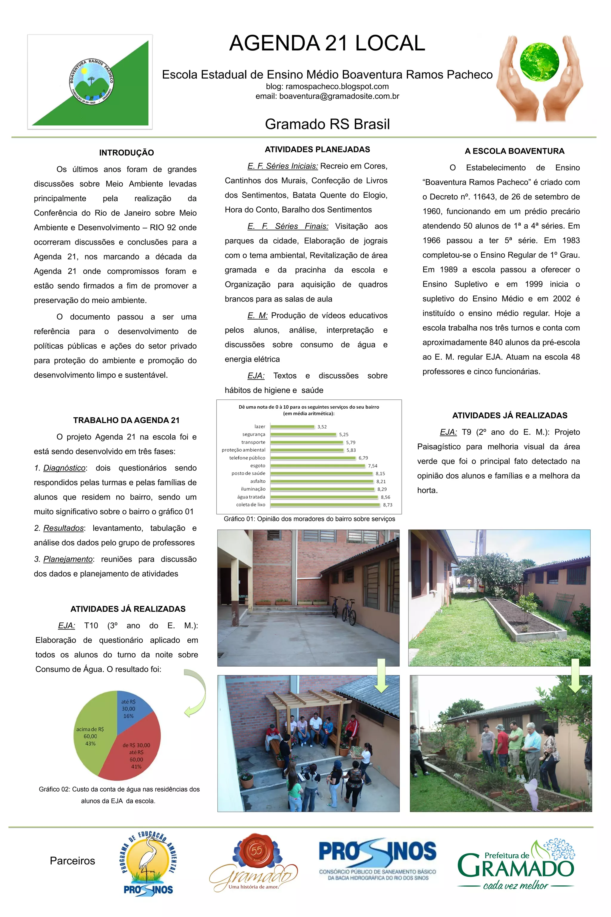 O documento descreve o trabalho da Agenda 21 realizado na Escola Estadual de Ensino Médio Boaventura Ramos Pacheco, localizada em Gramado, RS. O projeto envolveu diagnóstico com questionários para alunos e famílias, análise dos resultados e planejamento de atividades para as diferentes séries visando a conscientização ambiental e melhorias na escola. Atividades já realizadas incluíram projeto paisagístico e questionário sobre consumo de água.