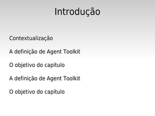 O documento apresenta uma introdução sobre agent toolkits e descreve alguns dos principais frameworks disponíveis, incluindo FIPA, ZEUS, RETSINA, IMPACT, JADE, JACK e Living Markets. Ele discute critérios para seleção de toolkits e fornece detalhes sobre arquitetura, funcionalidades e serviços oferecidos por cada um.
