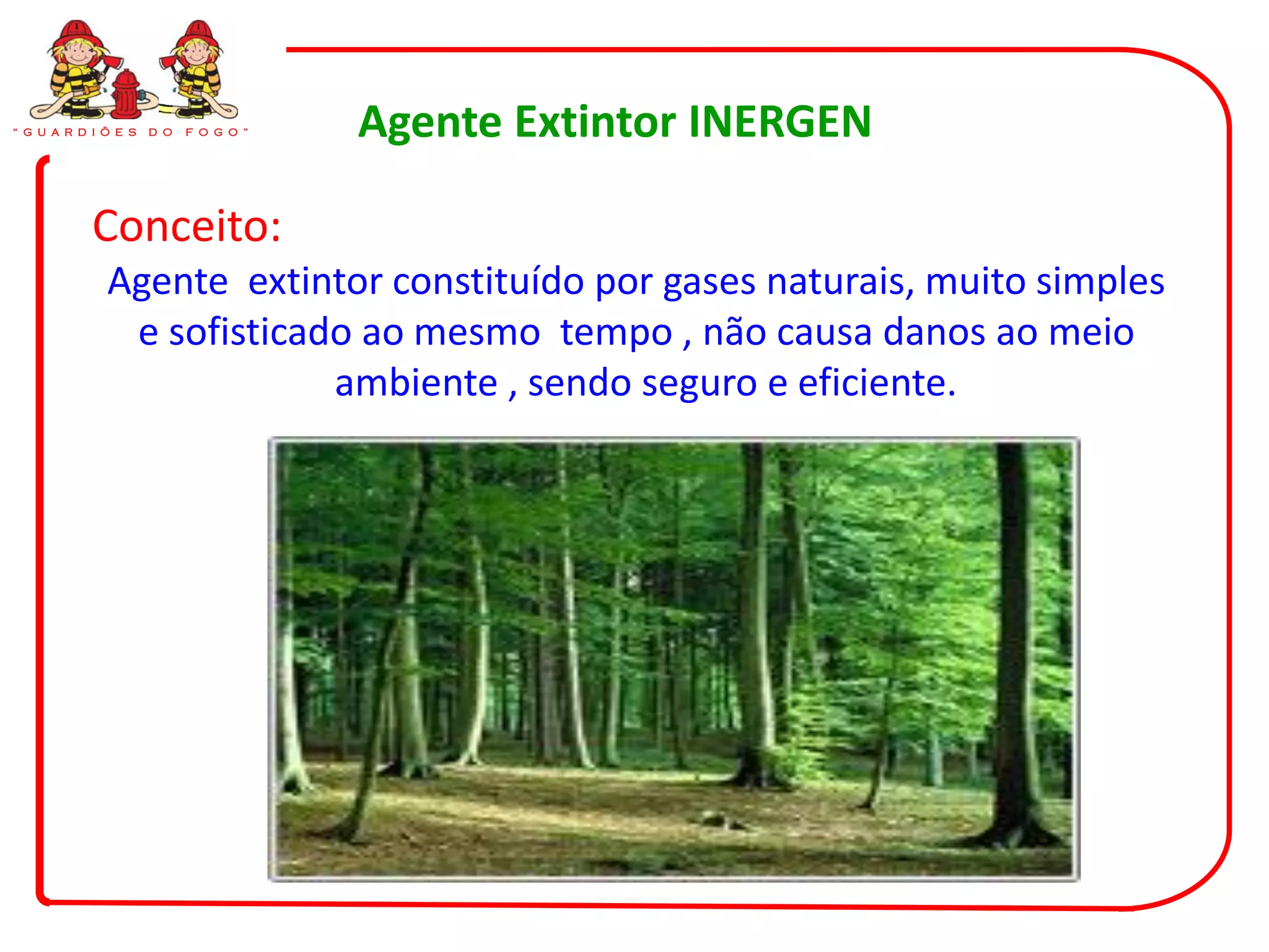 O documento descreve um agente extintor de incêndio chamado INERGEN, composto por nitrogênio, argônio e dióxido de carbono. O INERGEN atua nas classes de incêndio A, B e C, sem oferecer riscos à vida humana ou danos ao meio ambiente. Ele pode ser usado em ambientes confinados e ocupados.