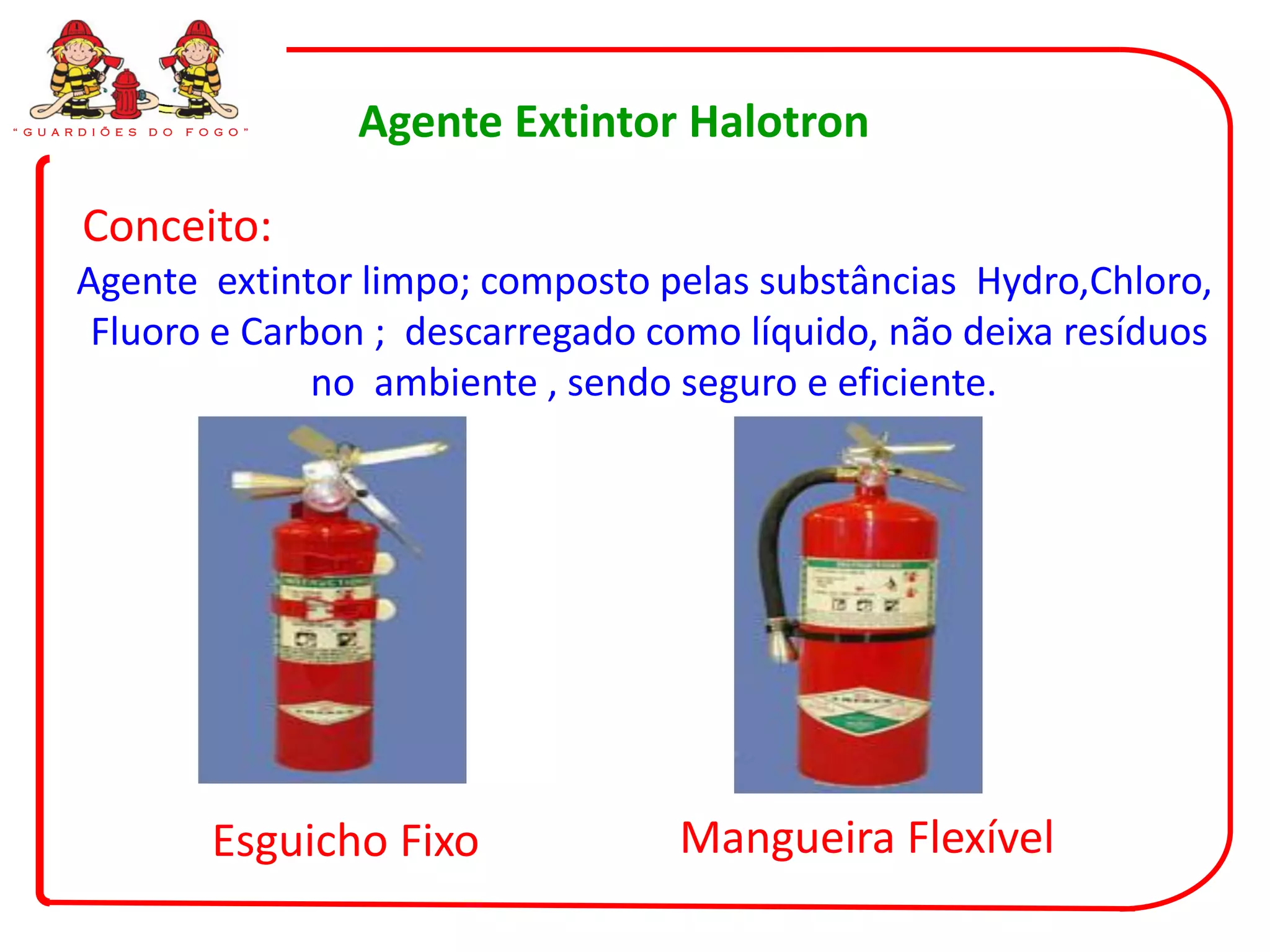 O documento descreve um agente extintor de incêndio chamado Halotron, que é um líquido não tóxico que se transforma em gás ao ser liberado para apagar fogo de forma segura e eficiente, deixando poucos resíduos. Ele pode ser usado em sistemas fixos ou móveis e é eficaz contra incêndios de classes A, B e C.