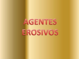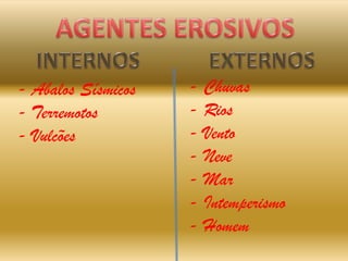 Os agentes erosivos internos e externos modelam o relevo terrestre. Agentes internos como terremotos e vulcões formam o relevo através de abalos sísmicos. Agentes externos como chuva, vento, rios, geleiras e mar modelam o relevo através de erosão. O homem também contribui para a modelagem do relevo através de suas ações.