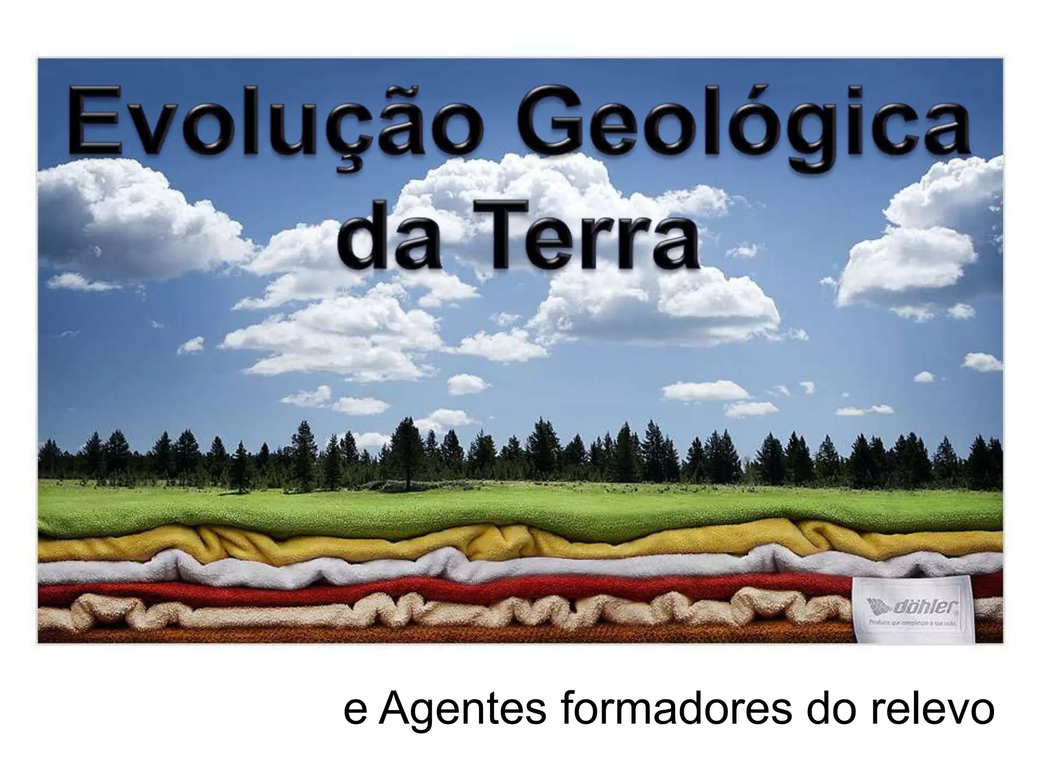 O documento descreve a evolução geológica da Terra e os agentes que formam o relevo terrestre. Detalha as camadas internas da Terra - crosta, manto e núcleo - e explica como a crosta é dividida em placas tectônicas. Também discute os processos de meteorização, erosão, transporte e sedimentação das rochas e como agentes internos e externos modificam o relevo ao longo do tempo.