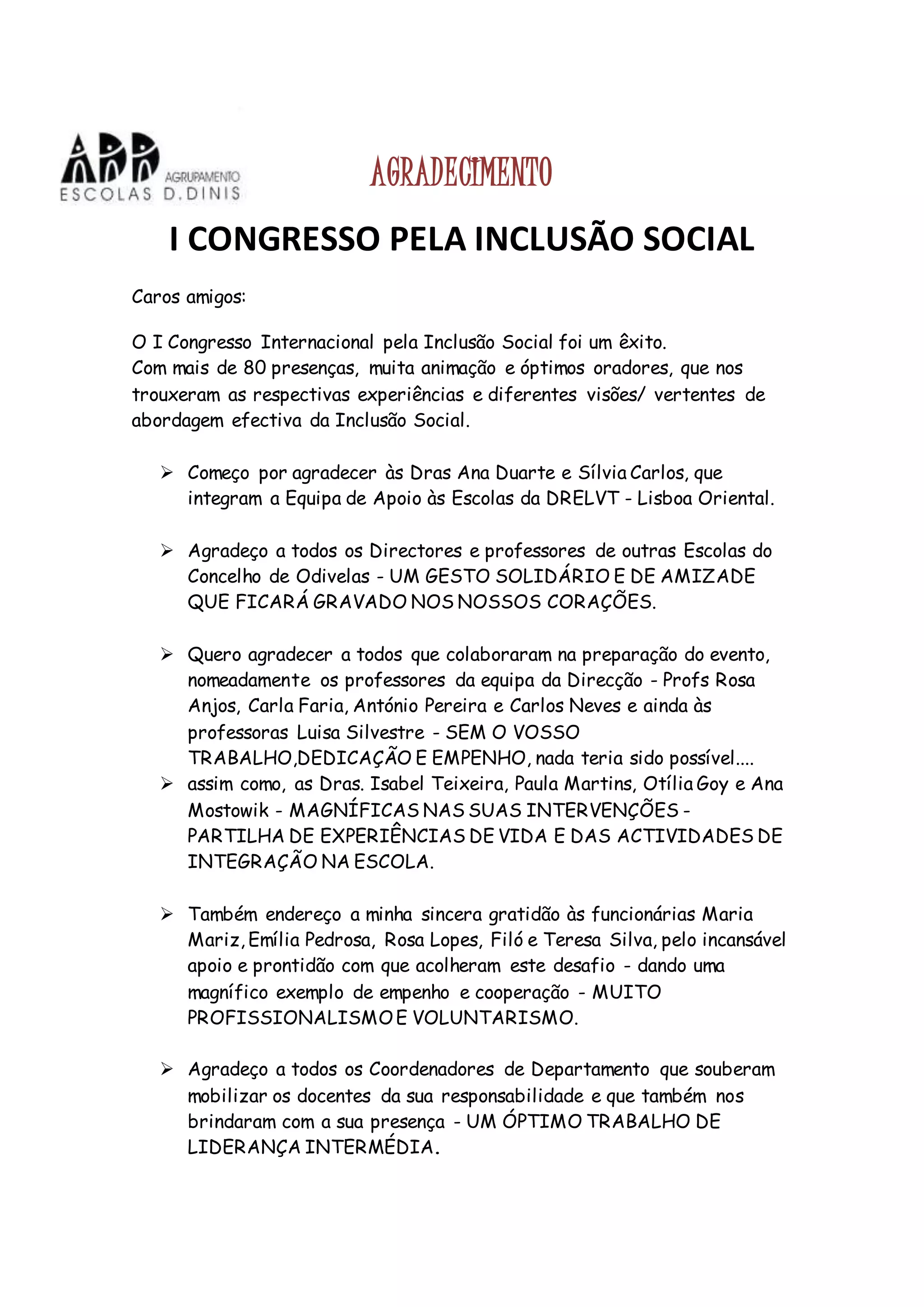 O documento agradece a participação de mais de 80 pessoas no I Congresso Internacional pela Inclusão Social, que contou com oradores e experiências sobre abordagens de inclusão social. Também agradece o trabalho de organização de professores, funcionários e patrocinadores, assim como as apresentações da orquestra, coro e pais presentes, destacando o sucesso do evento.