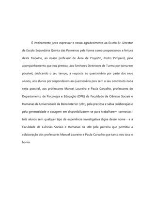 O documento expressa gratidão à direção da escola, ao professor orientador, aos diretores de turma e aos alunos por tornarem possível a realização de um trabalho de projeto. Agradecimento também é dirigido a dois professores universitários e à sua faculdade pela colaboração no trabalho.