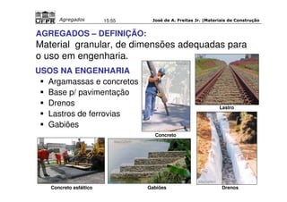 O documento discute agregados para construção civil, definindo agregados, classificando-os de acordo com origem, densidade e tamanho. Também aborda propriedades como massa específica, absorção de água, composição granulométrica e como estas afetam concretos e argamassas.