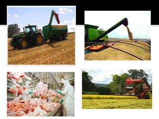 O documento discute a agroindústria no Brasil. Apresenta a agroindústria como o conjunto de atividades relacionadas à transformação de matérias-primas agrícolas e sua importância para a economia brasileira, representando 12% do PIB. Também destaca o crescimento do setor e sua participação relevante nas exportações, apesar da queda nos preços das commodities.