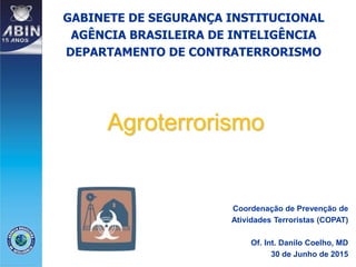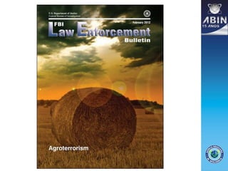 O documento discute o conceito de agroterrorismo como um subgrupo do bioterrorismo, caracterizado pela introdução deliberada de doenças em animais ou plantas para gerar medo e causar prejuízos econômicos. Apresenta casos históricos de ataques agroterroristas e enfatiza o papel da inteligência brasileira na prevenção e monitoramento de tais ameaças. Também menciona a necessidade de um modelo estratégico de contraterrorismo e vigilância em saúde específica para o setor agrícola.