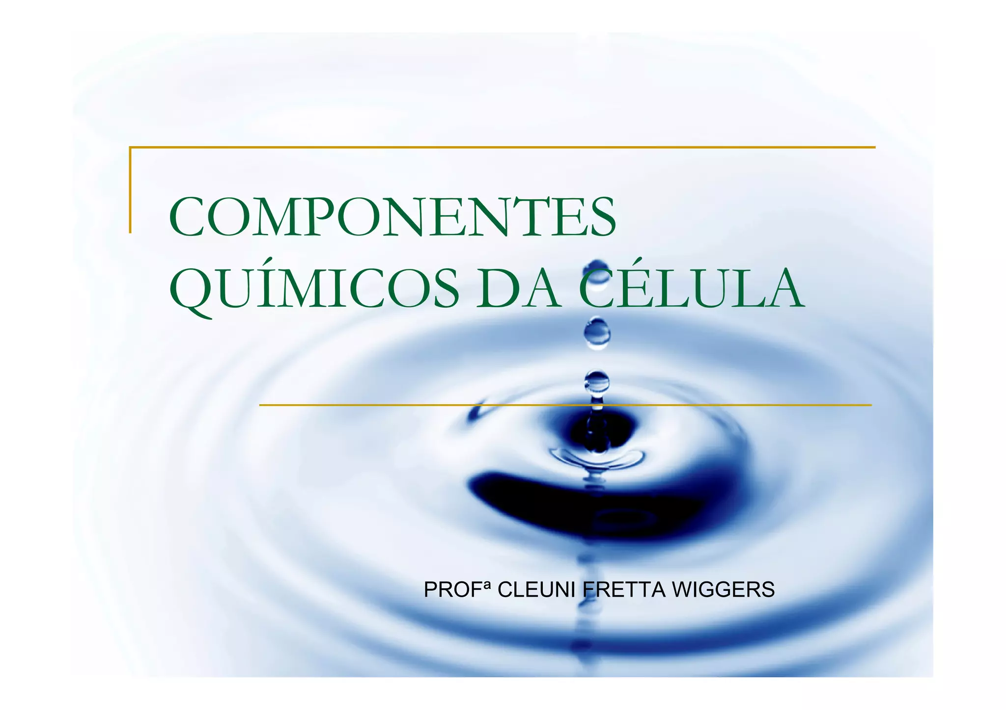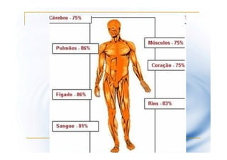O documento descreve os principais componentes químicos das células animais e vegetais, com destaque para a água. A água corresponde a cerca de 65-75% da massa dos seres vivos e desempenha funções vitais como solvente universal, regulador térmico e veículo de transporte de substâncias. Sua capacidade de absorver calor sem elevar muito sua temperatura também é importante para a termorregulação dos organismos.