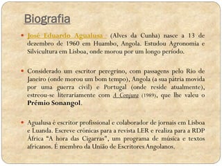 José Eduardo Agualusa é um escritor angolano nascido em 1960. Seus romances misturam ficção com fatos reais e transitam entre as culturas africana, portuguesa e brasileira. Agualusa já recebeu vários prêmios literários importantes pelo seu trabalho.