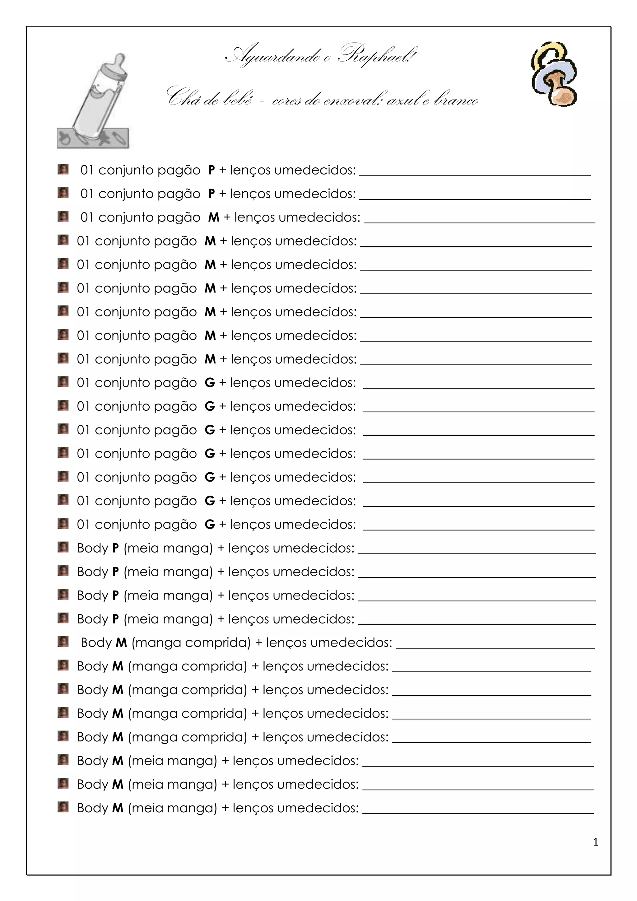 56769000219075171450Aguardando o Raphael!<br/>Chá de bebê - cores do enxoval: azul e branco <br /> 01 conjunto pagão P + lenços umedecidos: ____________________________________