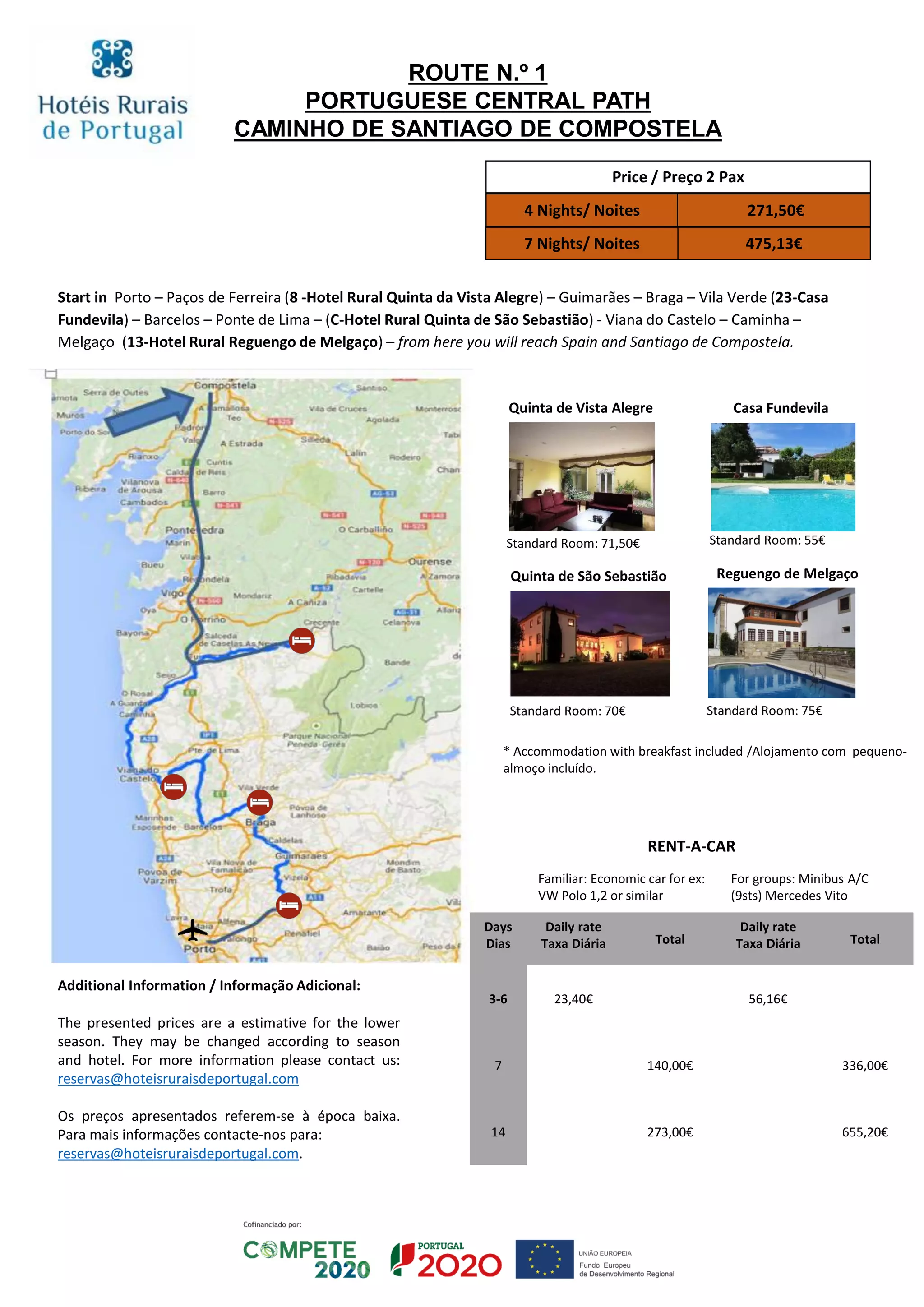 Este documento apresenta nove rotas para caminhadas e estadias rurais em Portugal, incluindo preços de alojamento e aluguel de carros. Fornece detalhes sobre distâncias, locais de parada e preços para cada rota, começando em cidades como Porto, Lisboa e outras.