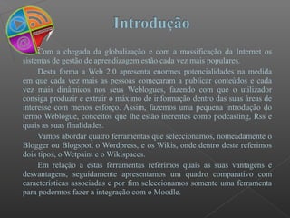 Este documento apresenta uma comparação entre diferentes ferramentas de gestão de conteúdo baseadas na web para integrar com o Moodle. Discute o Blogger, Wordpress, Wikis e realiza um quadro comparativo destas ferramentas, abordando vantagens e desvantagens. Conclui selecionando o Wordpress como a melhor ferramenta para a integração proposta devido às suas diversas vantagens como ser gratuito.
