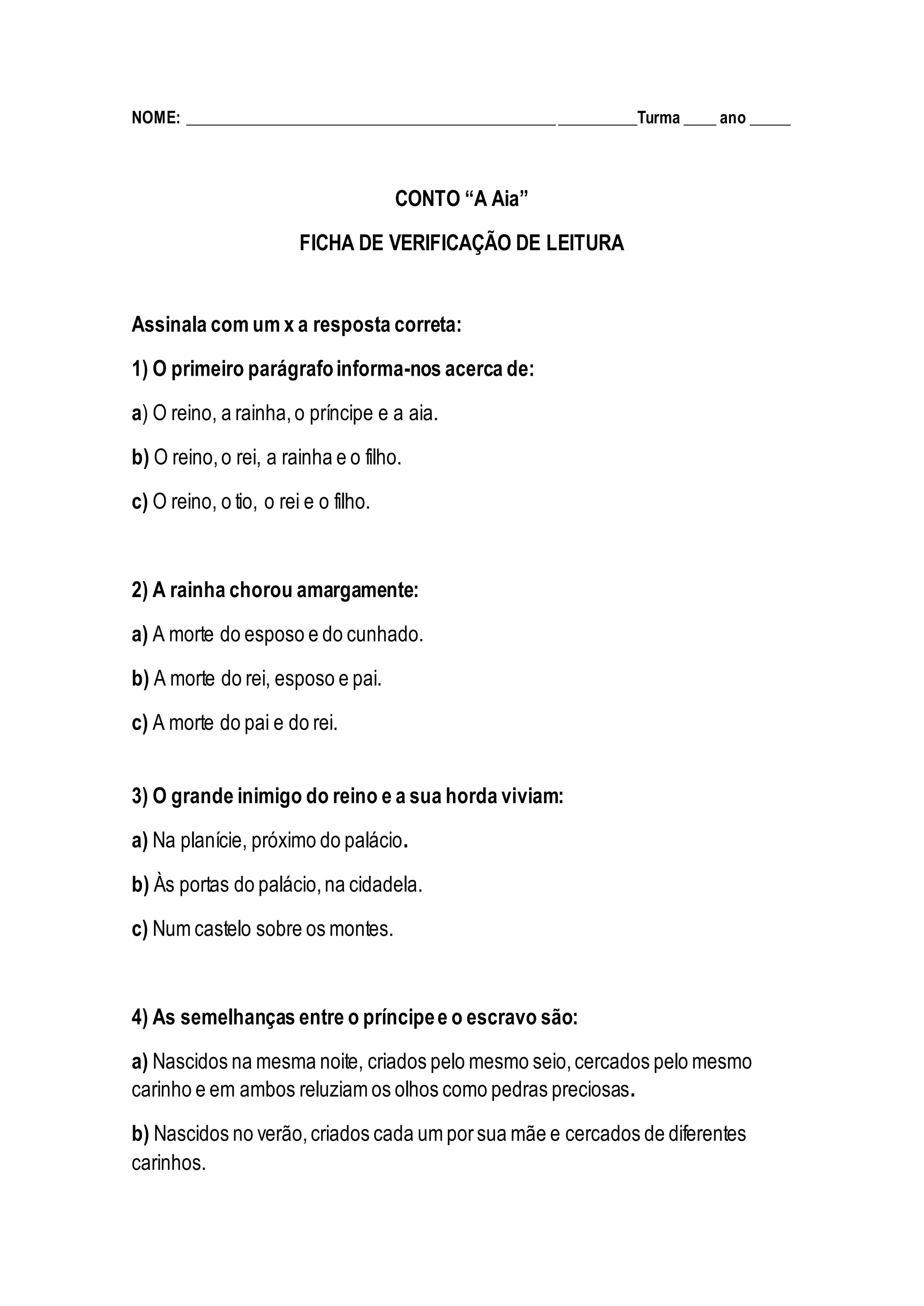O documento é uma ficha de verificação de leitura sobre o conto "A Aia". Contém 11 perguntas sobre os detalhes da história, incluindo sobre os personagens principais, os eventos que ocorreram no palácio real naquela noite e as ações e motivações da aia.