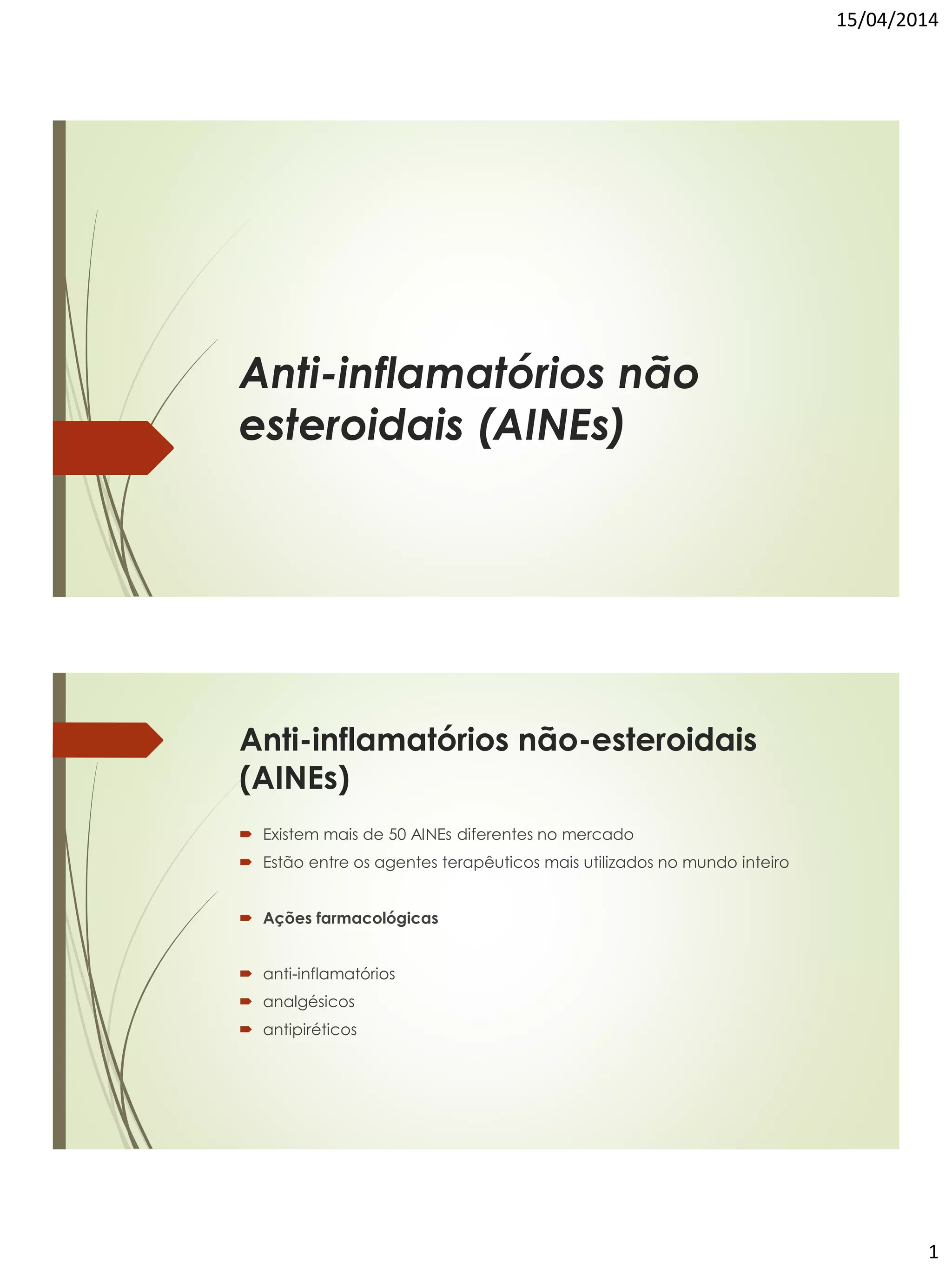 O documento discute os anti-inflamatórios não esteroidais (AINEs), incluindo sua ação farmacológica anti-inflamatória, analgésica e antipirética por meio da inibição da enzima ciclooxigenase. Também aborda os mecanismos da dor e inflamação e como os AINEs atuam nesses processos ao bloquear a síntese de prostaglandinas.