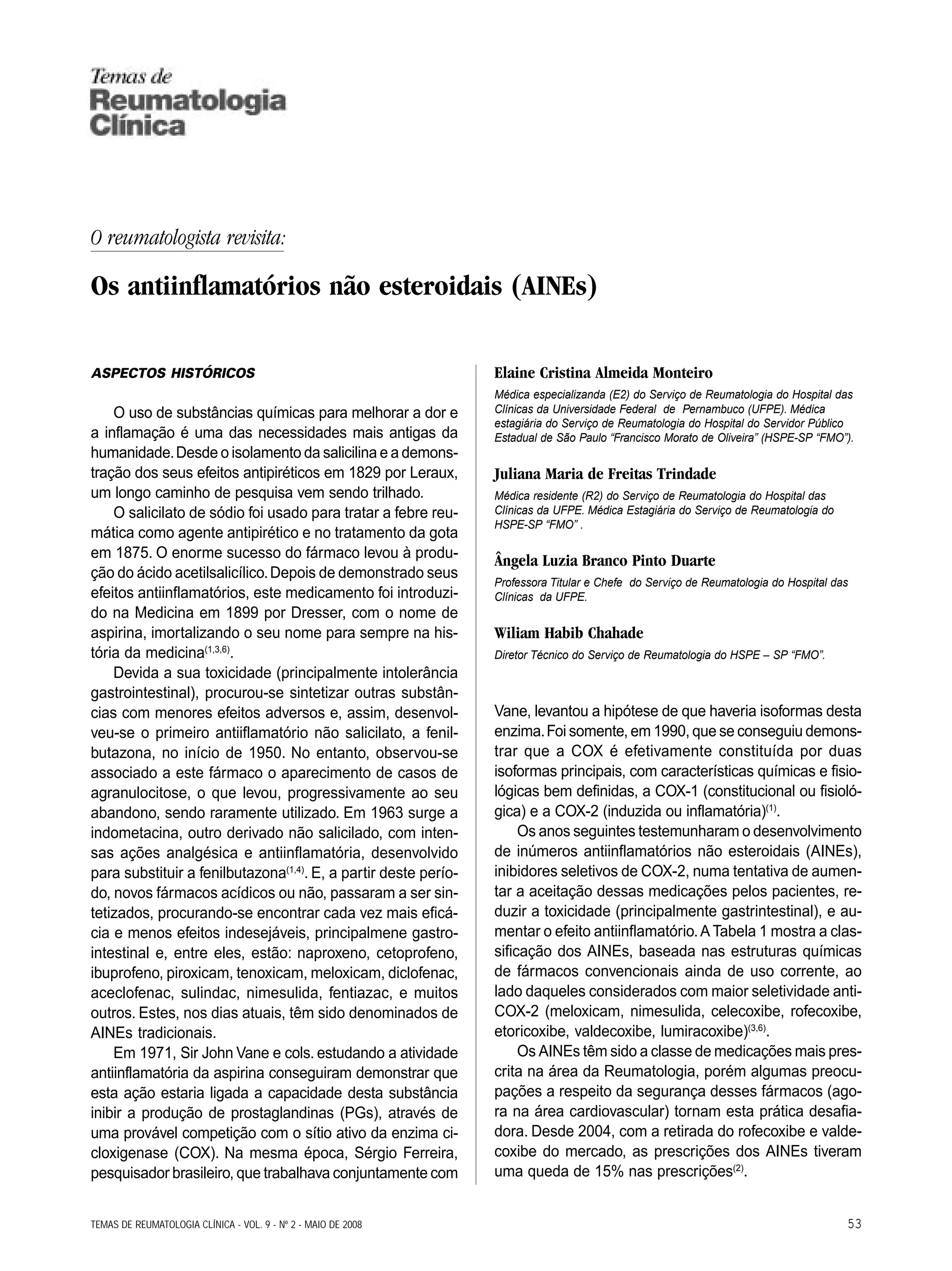 O documento discute a história e o mecanismo de ação dos antiinflamatórios não esteroidais (AINEs). Ele descreve como os AINEs inibem a ciclooxigenase (COX) para reduzir a produção de prostaglandinas, resultando em efeitos analgésicos e anti-inflamatórios, mas também causando efeitos colaterais. O documento traça o desenvolvimento dos diferentes tipos de AINEs ao longo do tempo e discute as duas isoformas da enzima COX.